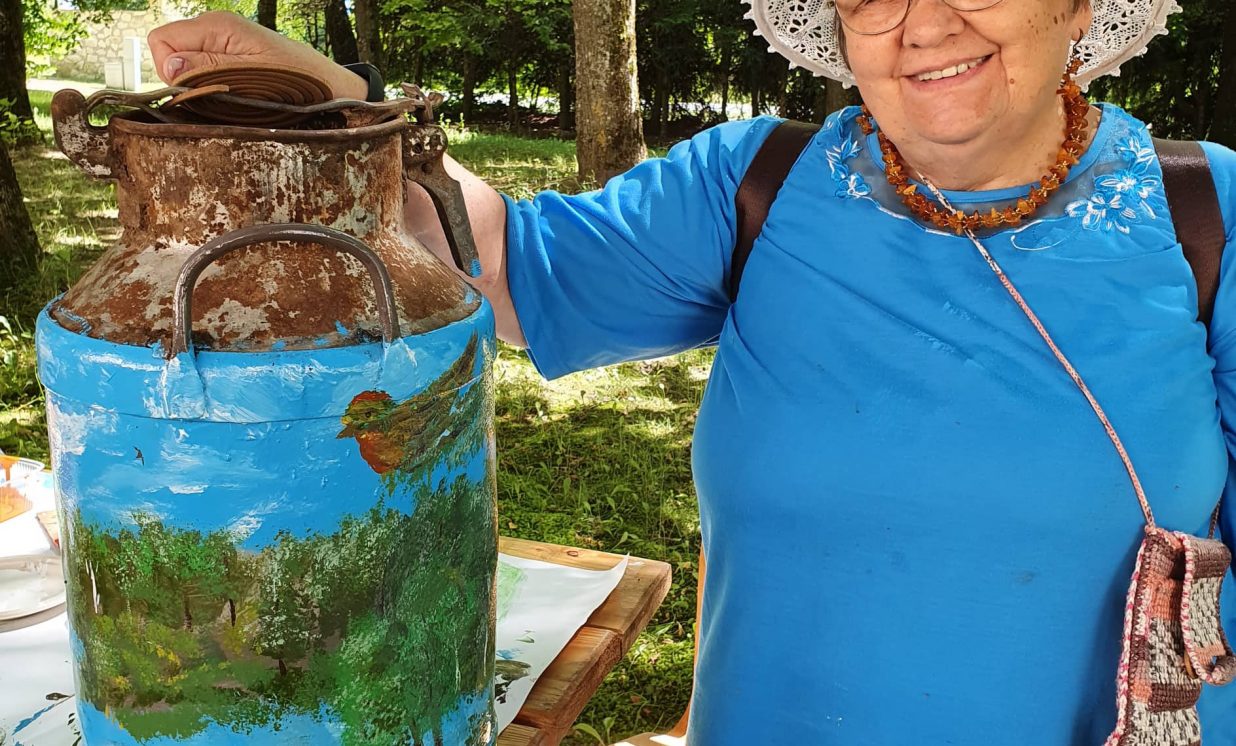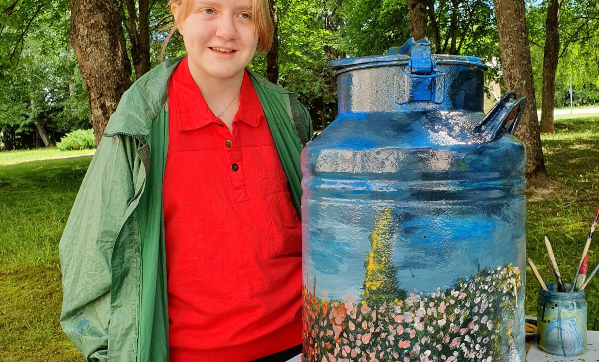 Skaistu gleznojumu uz piena kannas radīja pensionāre Janina Zajceva, kura īsi pirms pandēmijas sāka apgūt akvareļu tehniku un uzgleznojusi jau vairāk nekā 150 darbus.