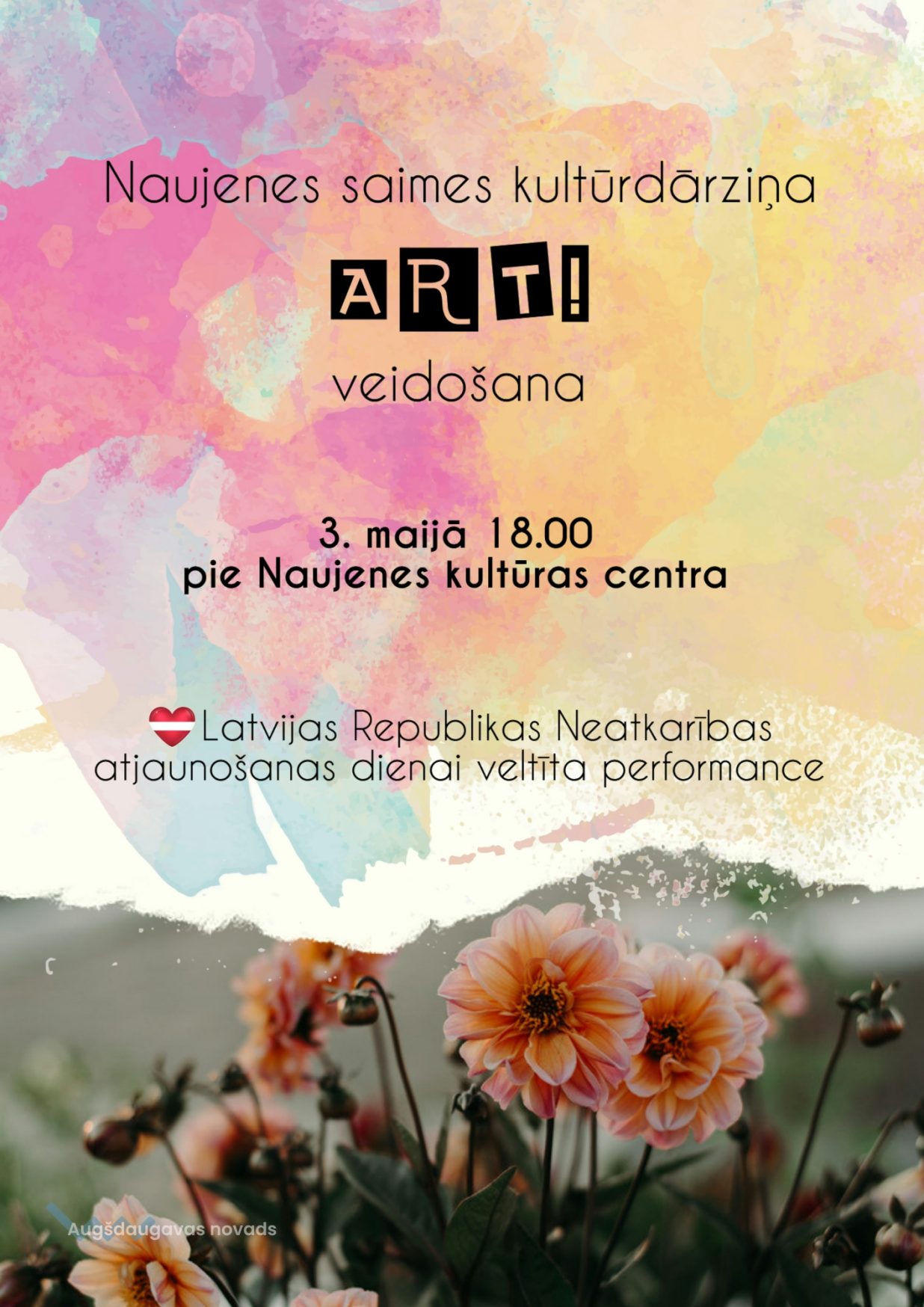 Latvijas Republikas Neatkarības atjaunošanas dienas priekšvakarā – 3. maijā plkst. 18.00, aicinām ikvienu interesentu pievienoties Naujenes kultūras centra lielajam un radošajam kolektīvam un veidot Naujenes saimes kultūrdārziņu “ART!”. Kopīgi veidosim brīnišķīgu kultūrdārziņu – stādīsim, laistīsim un vēlāk arī vāksim ražu, ko izaudzēsim.