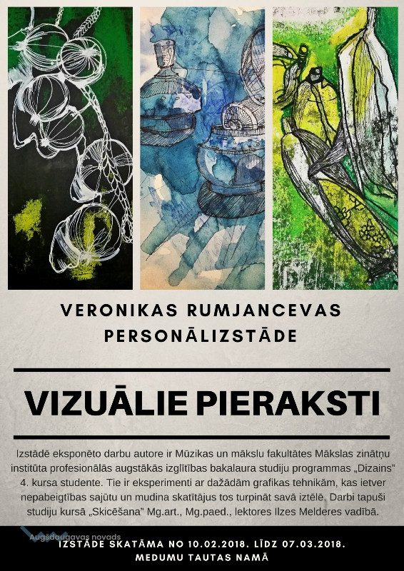 10. februārī pēc koncerta veltīta Valentīna dienai "No manas sirds tavējā" tiks atklāta Veronikas Rumjancevas personālizstāde "Vizuālie pieraksti", kura būs skatāma Medumu Tautas nama foajē līdz 7. martam. Izstādē eksponēto darbu autore ir Mūzikas un mākslu fakultātes Mākslas zinātņu institūta profesionālās augstākās izglītības bakalaura studiju programmas „Dizains” 4. kursa studente. Tie ir eksperimenti ar dažādām grafikas tehnikām, kas ietver nepabeigtības sajūtu un mudina skatītājus tos turpināt savā iztēlē. Darbi tapuši studiju kursā „Skicēšana” Mg.art., Mg.paed., lektores Ilzes Melderes vadībā.