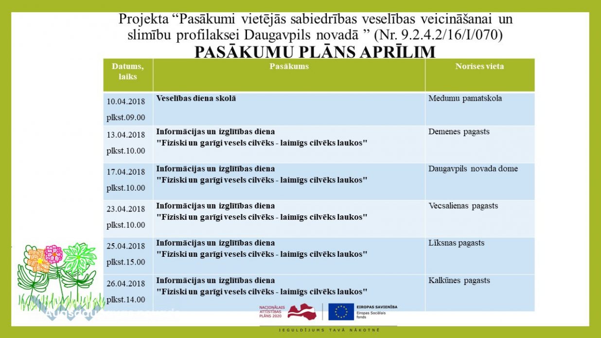 Projekta “Pasākumi vietējās sabiedrības veselības veicināšanai un slimību profilaksei Daugavpils novadā ” (Nr. 9.2.4.2/16/I/070) PASĀKUMU PLĀNS APRĪLIM