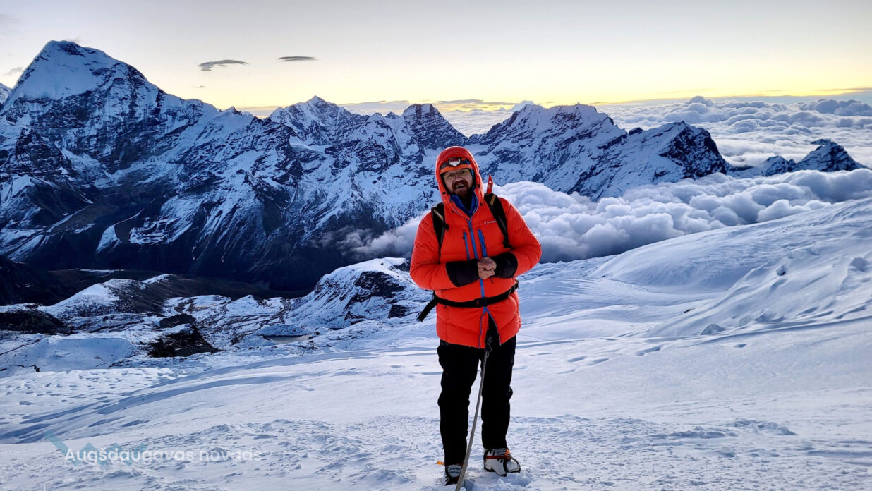 Vēl pirms dažiem gadiem Viktors bija lepns par to, ka viņam izdevās iekarot kalnu Risi Augstajos Tatros Polijas un Slovākijas robežā (2 501 m), bet jau 2023. gadā viņš pārvarēja piecu tūkstošu virsotni – kalnu Ararat Turcijā (5 165 m). Toreiz Sventes Tautas namā viņš organizēja pasākumu par savu ceļojumu, kur varēja redzēt arī “vizuālo materiālu”- ekipējumu un mantas, kas ir nepieciešami tālajā ceļojumā. 2024. gadā Viktors devās uz tālo Nepālu, lai ierakstītu savā iekaroto virsotņu sarakstā Mera piku Himalajos (6 461 m). Viņš joprojām nespējot noticēt, ka viņam izdevās to paveikt, arī grūti par to ceļojumu runāt, jo tā nerealitātes sajūta vēl ir stipri jūtama. “Nepālā trāpīju vissliktākajā laikā no visiem iespējamiem – sākas musoni, visas kalnu ielejas, visi ceļi applūduši, nākas 3 dienas gaidīt lidostā, kamēr mūs savāca helikopters. Lidostas telpās, kur parasti ir paredzēta vieta 60 cilvēkiem, mūs bija gandrīz 1500. Bija grupas, kuras gaidīja vēl vairākas dienas, bet mums paveicās,” stāsta Viktors. Ilga gaidīšana tikai spēcināja nepacietību pirms tikšanās ar milzu kalniem. Viktors bija mazas grupiņas sastāvā: divi ceļotāji bija no Izraēlas, viens no Ukrainas, viens no Kazahstānas un Viktors, kā arī vietējie pavadoņi. Tā kā īsts ceļojums sākas ar kavējumu, vajadzēja steigties, iet ātri, bet pirmajā gājiena dienā visu laiku stipri lija, ceļš bija slidens, un beigās bija milzīgs nogurums. Pēc tam kļuva vieglāk. Bija laiks aklimatizēties, paelpot, bet tomēr bija grūtības ar miegu, Viktors saka, ka nevarēja aizmigt, kad bija laiks gulēt, bet, kad gulēt gribas, vajag iet tālāk. Pēdējā diena pirms virsotnes arī bija ļoti grūta, karstums, aukstums, vējš, spēka vairs nebija. “Otrā elpa neatvērās, es jau nezinu, kā es tiku galā. Es pat aizmirsu izvilkt Latvijas karogu. Nekādu sajūtu tur augšā nebija. Sajūtas parādās tad, kad tu nokāp, un pēc tām mājās – tad tu paliec traks,” stāsta Viktors un piebilst, ka ļoti daudz cilvēku nespēj tikt līdz virsotnei. No Mera pika redzamas pasaules sešas lielākās 8000 m virsotnes, ieskaitot Everestu. Tādu skatu nekad nevar aizmirst. Pēc diviem gadiem Viktors plāno iekarot 7000 m virsotni Kirgizstānā. “Bet tas vēl ir noslēpums,” saka Viktors. Kurš, ja ne viņš zina, ka aizraušanās ar kalniem ir dārgs prieks. “Es ceru, ka man izdosies, ka uz manis no debesīm nokritīs maiss ar naudu.”