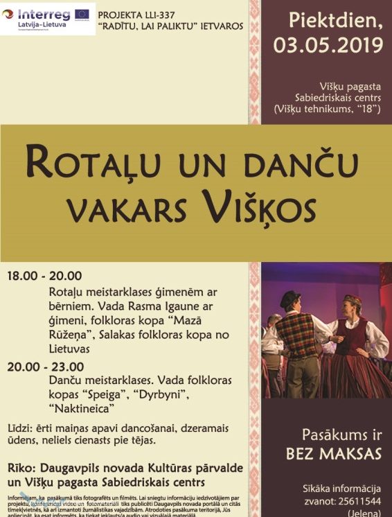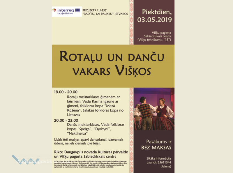 Rotaļu un danču vakaru Višķos rīko Daugavpils novada Kultūras pārvalde kā vienu no aktivitātēm projektā* Nr.LLI-337 “Zarasu rajona un Daugavpils novada mazaktīvo teritoriju iedzīvotāju radošuma un uzņēmējdarbības aktivitātes atbalstīšana, izmantojot sociālkultūras pasākumus” (“Radītu, lai paliktu”). Projekta vadošais partneris ir Zarasu rajona Kultūras centrs.