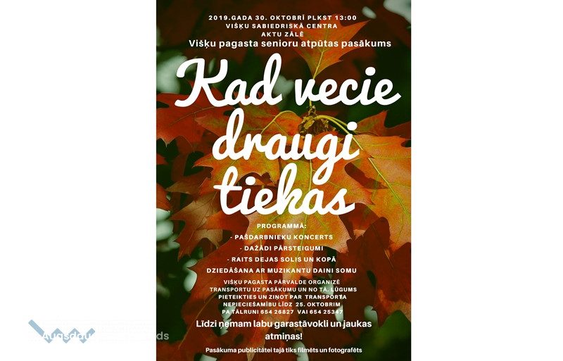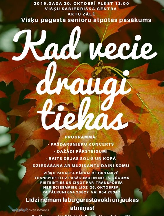 30. oktobrī plkst. 13.00 Višķu sabiedriskā centra aktu zālē notiks Višķu pagasta senioru atpūtas pasākums "Kad vecie draugi tiekas". Programmā: koncerts, pārsteigumi un dziedāšana ar muzikantu Daini Somu. Transportam uz/no pasākuma nepieciešamības gadījumā lūgums pieteikties iepriekš pa tel. 654 26827 vai 654 25347.