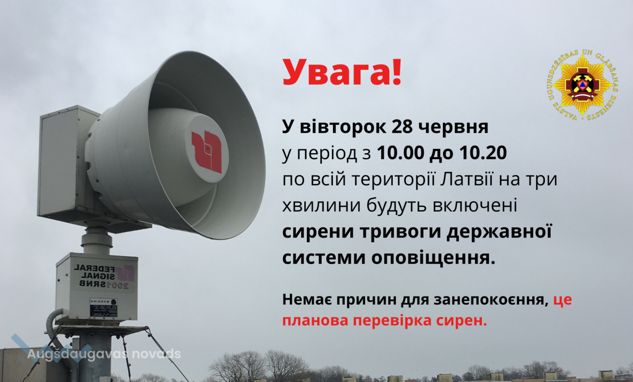 28.jūnijā no plkst.10.00 līdz plkst.10.20 visā valstī tiks iedarbinātas trauksmes sirēnas uz trim minūtēm. Iedzīvotājiem nav pamata uztraukumam, jo tā ir kārtējā trauksmes sirēnu pārbaude. Gadījumā, ja trauksmes sirēnu pārbaudes laikā tās nedzirdat, nesatraucieties, jo ārkārtas gadījumos, kur sirēnas nav dzirdamas vai izvietotas, var tikt izmantoti citi apziņošanas veidi, piemēram, informācijas nodošana sabiedrībai caur operatīvo dienestu un to sadarbības partneru skaļruņiem. VUGD aicina viesnīcu administrāciju informēt savus ārvalstu viesus par gaidāmo trauksmes sirēnu pārbaudi, lai nerastos lieki uztraukumi.