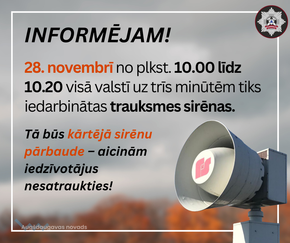 28. novembrī no plkst. 10.00 līdz plkst. 10.20 visā valstī uz trīs minūtēm tiks iedarbinātas trauksmes sirēnas. Iedzīvotājiem nav pamata uztraukumam, jo tā būs kārtējā trauksmes sirēnu pārbaude, pārliecinātos par agrīnās brīdināšanas sistēmas tehnisko gatavību – trauksmes sirēnu tehnisko stāvokli, iespējamiem bojājumiem vai traucējumiem sirēnu darbībā, kā arī noslēgto līgumu darbības izpildi starp VUGD un elektroniskajiem plašsaziņas līdzekļiem (radio, TV), kas apdraudējuma gadījumā informēs sabiedrību.