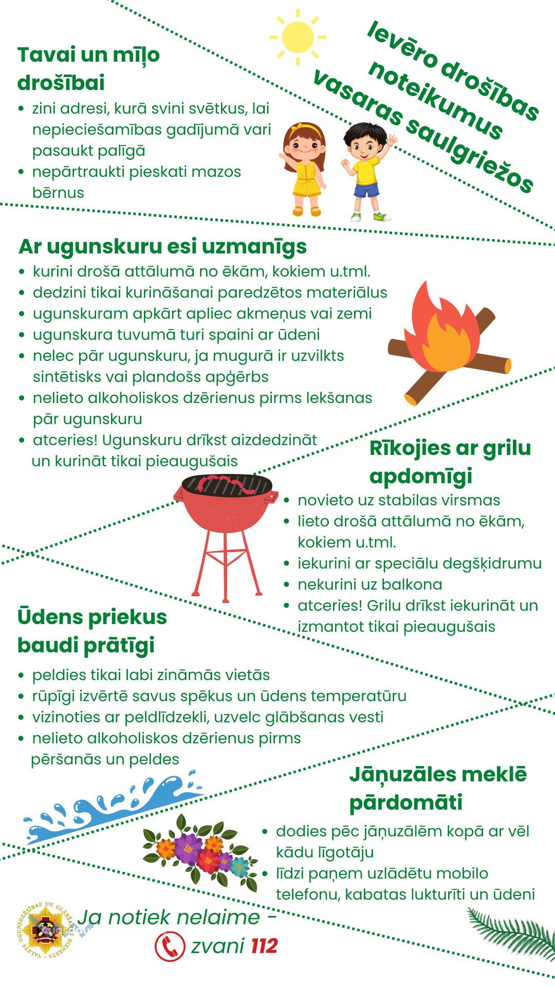 Šonedēļ Latvijā svinēsim Līgo un Jāņu dienu, kad neiztikt bez lustīgas svētku svinēšanas, ugunskuru kurināšanas, atpūtas dabā un peldēšanās. Šogad svētki daudziem iedzīvotājiem sniedz iespēju atpūsties četras dienas pēc kārtas, tādēļ Valsts ugunsdzēsības un glābšanas dienests (VUGD) īpaši uzsver drošības noteikumu ievērošanu, lai svētkus un brīvdienas neaptumšotu traģiski nelaimes gadījumi.