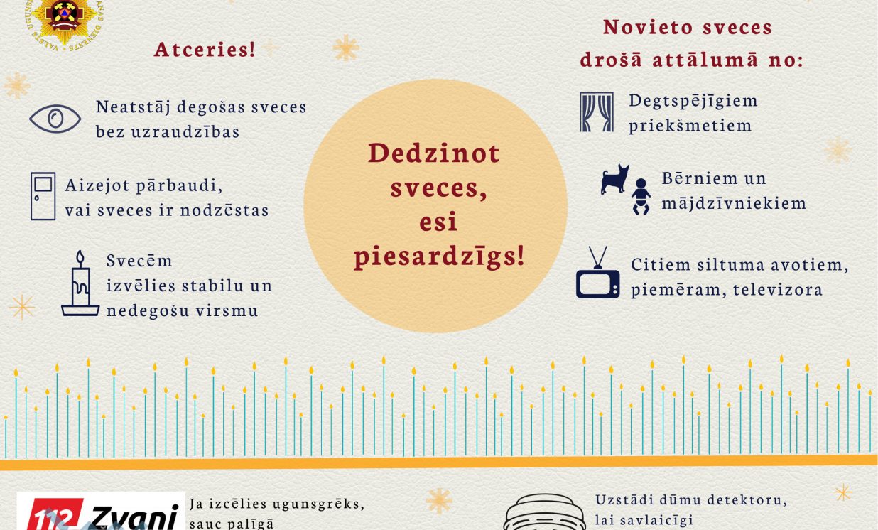 2019.gadā ugunsdzēsēji glābēji devās dzēst 17 ugunsgrēkus, kuru iespējamais izcelšanās iemesls bija saistīts ar degošām svecēm, kas bez uzraudzības atstātas mājoklī, adventes vainagos vai eglītēs. Šogad reģistrēti jau vairāk nekā 20 ugunsgrēki, kas izcēlušies bez uzraudzības atstātu sveču dēļ, un tajos ir cietuši četri, bet gājis bojā viens cilvēks.