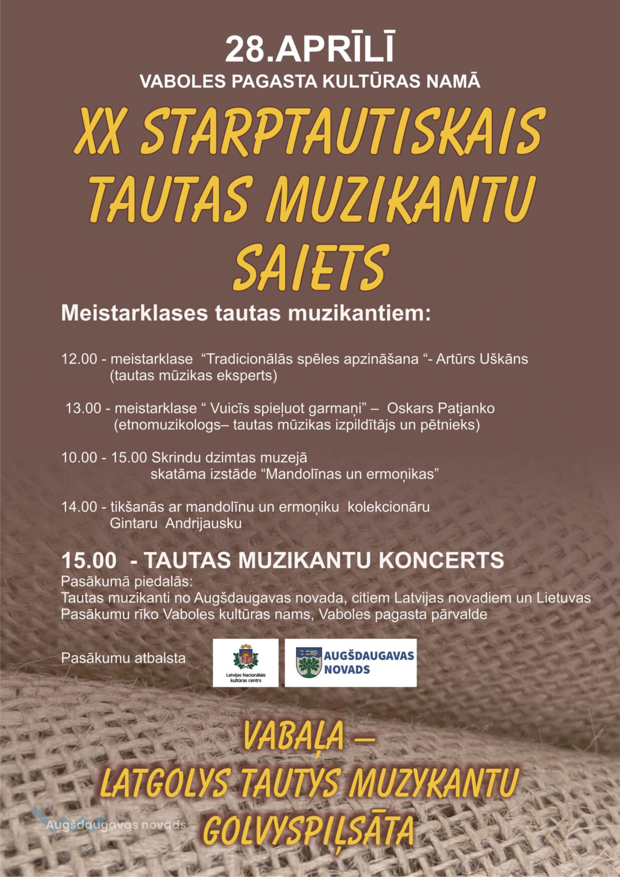 Tautas muzikantu svētki Vabolē šogad atzīmē savu 20 gadu jubileju, kas ir viens no nozīmīgākajiem pasākumiem Latgales novada muzikantiem. Vaboles Kultūras nama zāli atkal piepildīs ermoņiku, akordeona melodijas un muzikantu balsis no Augšdaugavas novada, Daugavpils un citiem Latvijas novadiem, kā arī viesi no Lietuvas.