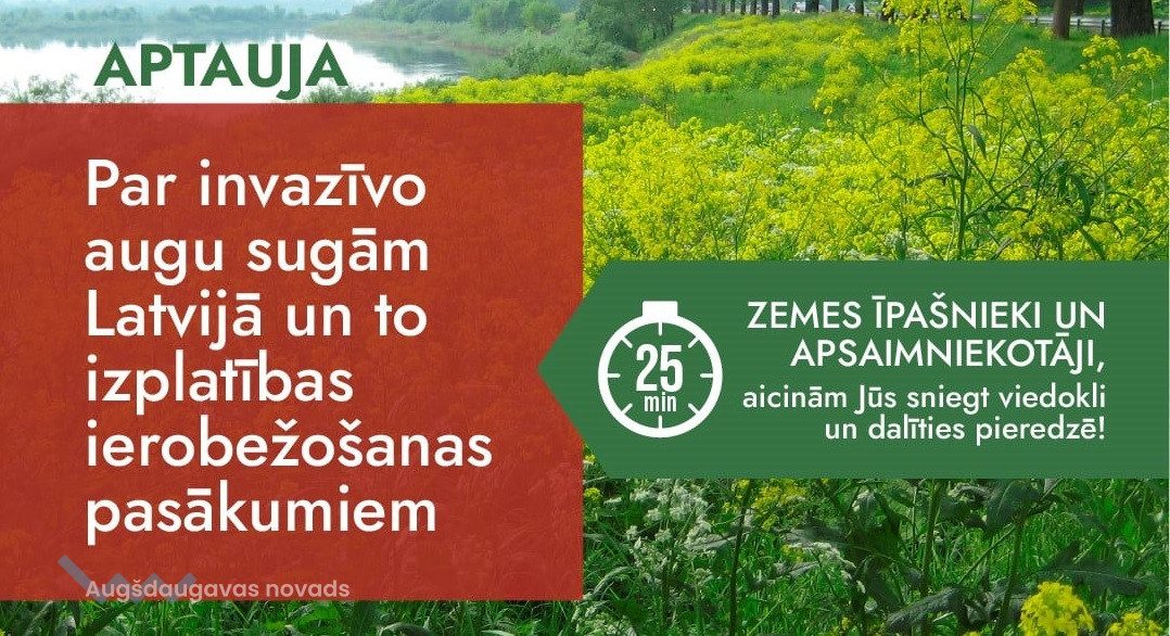 Aptauja norisināsies līdz 2021. gada decembrim, anketas aizpildīšanai nepieciešamas aptuveni 30 minūtes, tā pieejama tiešsaistē: bit.ly/invazīvās-augu-sugas_aptauja. Rezultāti tiks publicēti LIFE Integrētā projekta LatViaNature tīmekļvietnē 2022. gada pavasarī.