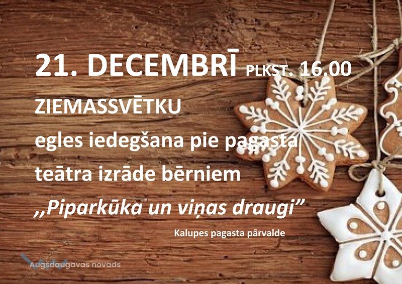 Ziemassvētku egles iedegšana Kalupē13.12.2018AKTUĀLI 21. decembrī plkst. 16.00 pie Kalupes pagasta pārvaldes ēkas tiks iedegda pagasta egle un bērni varēs noskatīties teātra izrādi "Piparkūka un viņas draugi".