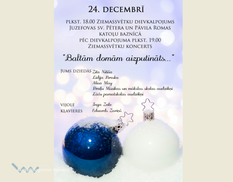 24. decembrī katrs no Jums ir mīļi aicināts uz Ziemassvētku koncertu “Baltām domām aizputināts…”, kas notiks Juzefovas sv. Pētera un Pāvila Romas katoļu baznīcā.