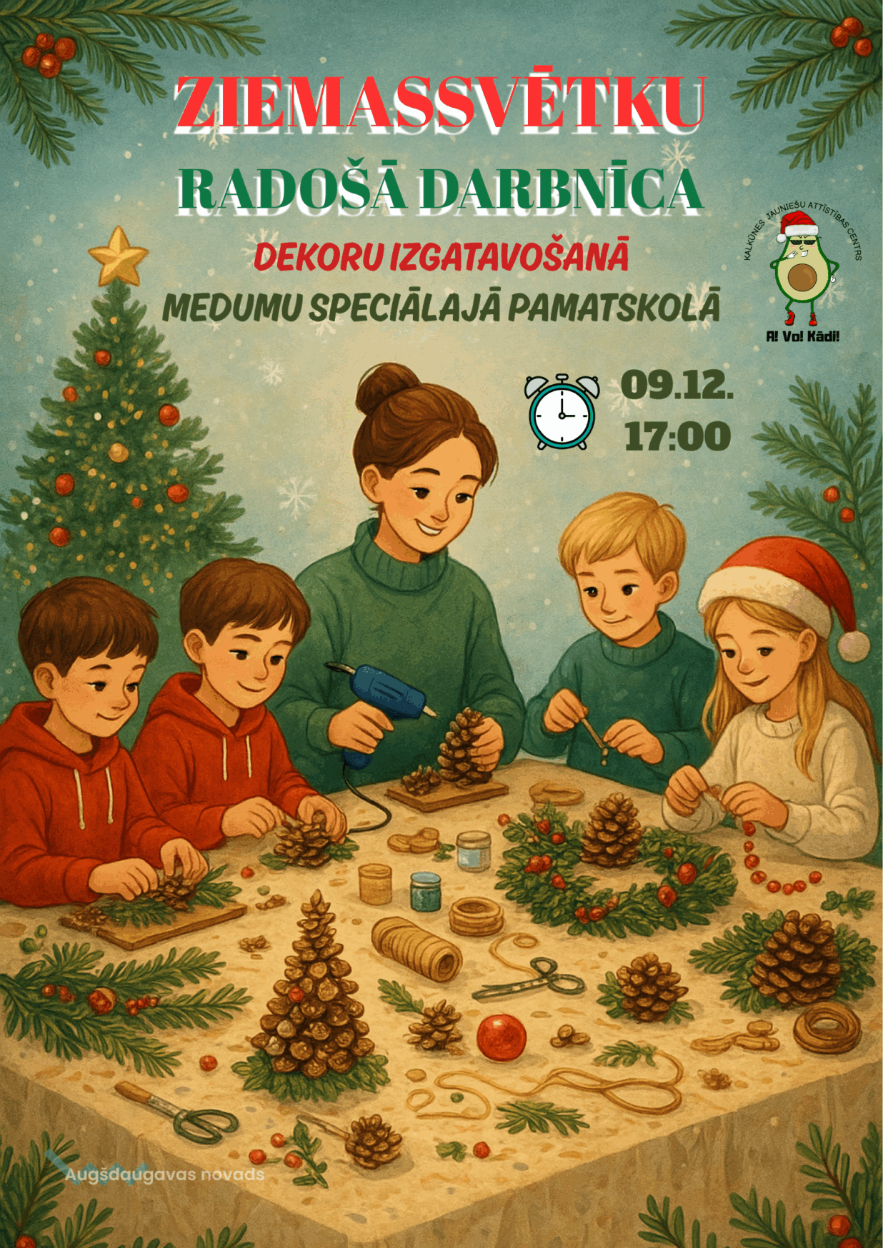 9.decembrī, plkst. 17:00 Medumu Iespēju pamatskolā, Ilgas ielā 15, Medumos, Kalkūnes Jauniešu attīstības centra jaunieši jau tradicionāli skolas audzēkņiem rīkos pasākumu “Ziemassvētku radošās darbnīcas”, kuru laikā kopā izgatavosim Ziemassvētku dekorācijas un jautri pavadīsim laiku!