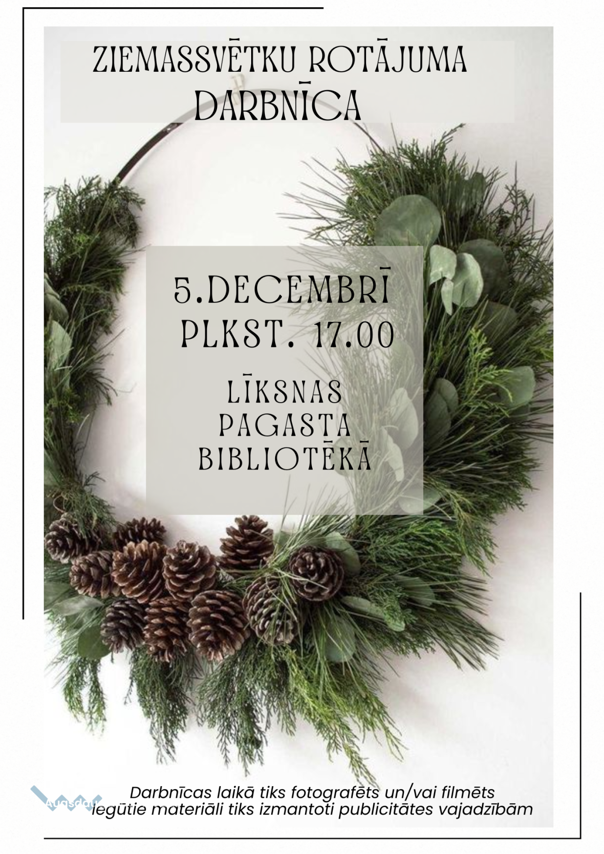 Līksnas pagasta bibliotēka un Vaboles jauniešu attīstības centrs aicina piedalīties Ziemassvētku rotājuma darbnīcā! 5.decembrī plkst. 17.00 pagasta bibliotēkā norisināsies Ziemassvētku rotājuma veidošanas darbnīca. Katrs darbnīcas apmeklētājs pagatavos rotājumu no egļu vai priežu zariem, izrotājot to kā sirdij tīk, ko vēlāk varēs paņemt līdzi. Vietu skaits ierobežots, tādēļ piesakies jau tagad, rakstot vai zvanot 25275592 Laurai.