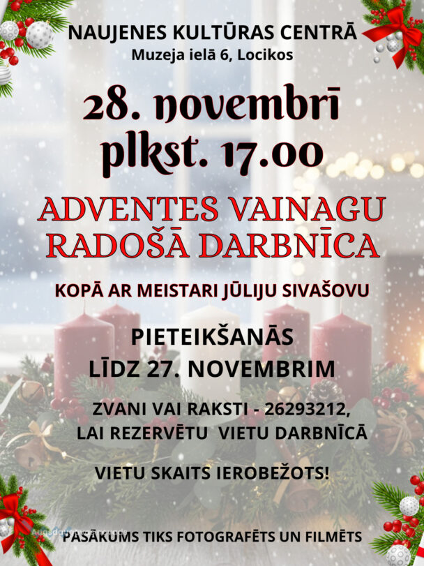 Adventes vainagu radošā darbnīca “Mana pirmā gaisma”28.11.2025Kultūra Vieta: Naujenes kultūras centrsLaiks:17:00Datums:28.11.2025